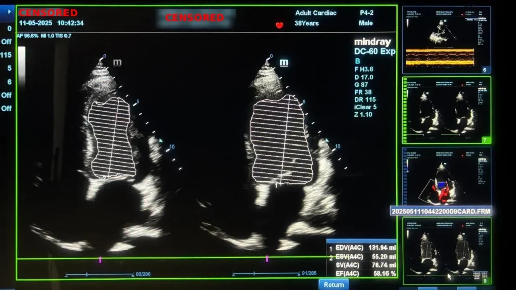 Pasien kemudian memutuskan mengikuti Program CardiacSave dengan pemantauan ketat melalui echocardiografi, laboratorium jantung, dan EKG. Hasilnya sangat menggembirakan. EF meningkat drastis menjadi 58,16 persen, kembali ke rentang normal. Perfusi jantung membaik, gejala kongestif berkurang, dan akumulasi cairan hilang sepenuhnya.